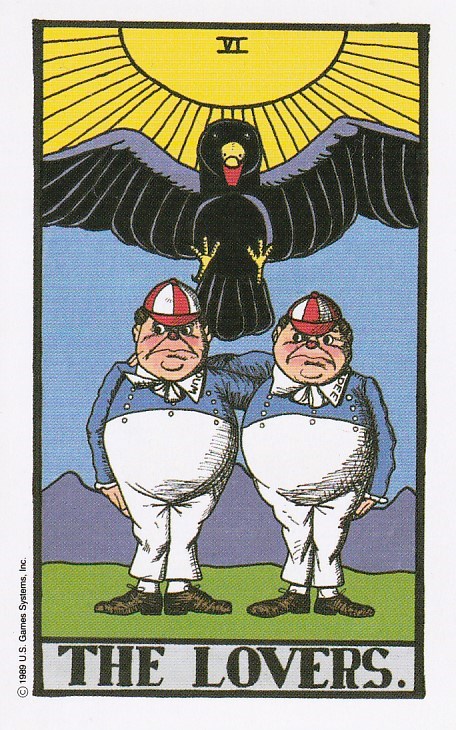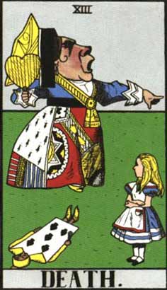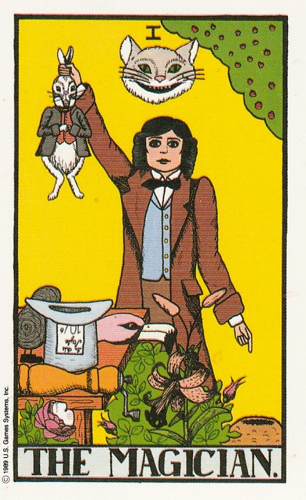 通称「不思議の国のアリスのタロット」、1989年版は黄色い箱に、初版のイラストレーター、ジョン・テニエルのタッチで描きあらわされた「鏡の国のアリス」が描かれたポケットサイズ=ミドルサイズのタロットでした。中古品が海外サイトで1~3万円で散見されています。